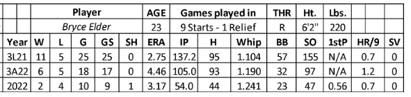 Over two seasons in the minors, Elder went 17-10 with a 3.49 ERA and 252 strikeouts over 242.2 innings. Despite an up-and-down season at AAA (4.46 ERA), the Braves gave him the first call when they needed an extra starter in August and September. He went 2-4 with a 3.17 ERA and 47 strikeouts over 54 innings. His walk rate (3.8) came in high while posting a low strikeout rate (7.8).