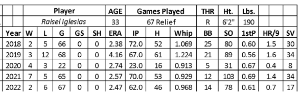 Over the last seven seasons, Iglesias went 24-36 with a 2.75 ERA, 556 strikeouts, and 157 saves over 448.1 innings.