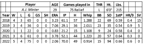 After a brutal 2019 (7.06 ERA and 2.011 WHIP) that required a trip back to AAA (3.57 ERA), Minter regained his form in 2020 and 2021 (4-7 with a 2.92 ERA and 81 strikeouts over 74 innings).