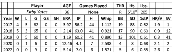 After looking sharp in his first appearance in 2020 (no runs or hits over one innings with two strikeouts), Yates blew up in his next two games (four runs and nine baserunners over 1.1 innings), setting him on a path for a lost season due to a right elbow injury. He ended up having TJ surgery the following March.