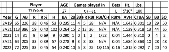 Over six seasons in the minors, Friedl hit .275 with 303 runs, 40 home runs, 208 RBIs, and 89 stolen bases over 1,856 at-bats. In his two years of experience at AAA, he hit .269 with 92 runs, 20 home runs, 74 RBIs, and 23 stolen bases over 591 at-bats. Friedl posted strength in his walk rate (10.2) while having a favorable strikeout rate (17.3).