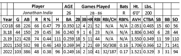 Unfortunately, India had his year derailed in April and May last season by landing on the injured list for 54 days with a hamstring injury. As a result, he only hit .204 over his first 113 at-bats with eight runs, two home runs, nine RBIs, and one steal). His stats over his final 273 at-bats (.267/40/8/32/2) failed to match his success in his rookie season.