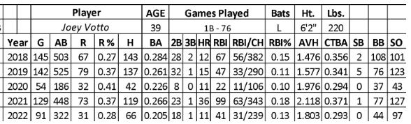 After a quiet first 22 games last season (.122/4/0/3 over 74 at-bats), Votto missed 18 days with a battle with Covid-19. He hit .226 over his next 252 at-bats with 27 runs, 11 home runs, and 38 RBIs while battling a slight back issue in early July. His season ended in mid-August with a torn rotator cuff in his left shoulder that required surgery.