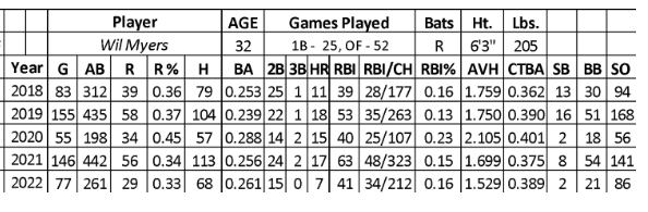 The Padres never gave him full-time at-bats in any month in 2021, leading to dull stats on too many days. Over the first four months of last season (.234/13/1/19 over 124 at-bats), Myers missed time with left thumb and right knee injuries. His year ended with a .285 batting average over 137 at-bats with 16 runs, six home runs, and 22 RBIs while striking out 31.6% of the time.