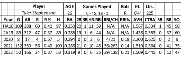 Over the past three seasons, the Reds gave him 533 at-bats, leading to a .296 batting average with 84 runs, 18 home runs, and 86 RBIs. His bat was on the rise in 2022 over his first 166 at-bats (.319/24/6/35/1). Unfortunately, Stephenson had his season ultimately end in early June (he only played eight more games) due to a fractured right thumb and right shoulder injury (broken clavicle).