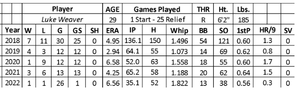 Unfortunately, Weaver struggled over the past five seasons (16-30 with a 4.86 ERA and 345 strikeouts over 354 innings). His struggles and injuries (thumb and elbow) led to him pitching out of the bullpen in 2022 (6.56 ERA, 18.22 WHIP, and 38 strikeouts over 35.2 innings). Despite his failure, Weaver only allowed one run with a reasonable strikeout rate (9.6) and walk rate (3.3).