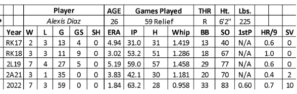 After an unimpressive minor league career (15-12 with a 4.03 ERA and 265 strikeouts over 199 innings) over five seasons, Diaz turned into a dominating arm in his first year with the Reds. Batters only hit .131 against him, with his best value coming against right-handed pitching (.107 with two home runs and 53 strikeouts over 112 at-bats).