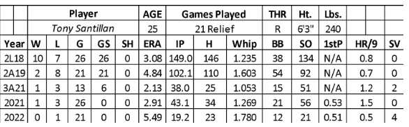 Santillan threw the ball well in 2018 between High A and AA, leading to a 10-7 record with a 3.08 ERA and 134 strikeouts over 149 innings. He repeated AA the following season with no success over 21 starts (2-8 with a 4.84 ERA, 1.603 WHIP, and 92 strikeouts over 102.1 innings). The Reds shifted him to a semi-bullpen role in 2021 at AAA (2.13 ERA and 51 strikeouts over 38 innings) after sitting out the Covid-19 season.
