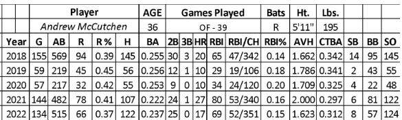 In 2022, McCutchen struggled over his first 41 games (.205/16/3/19/3 over 166 at-bats). From June 5th to July 31st, he hit .305 with 30 runs, seven home runs, and 27 RBIs over 177 at-bats. Unfortunately, his season ended with another disappointing 172 at-bats (.198/20/7/23).