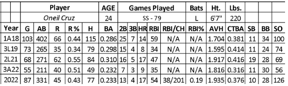 Over six seasons in the minors, Cruz hit .275 with 291 runs, 58 home runs, 242 RBIs, and 71 stolen bases over 1,733 at-bats. In 2021, he missed some development time with a right forearm issue. His bat played well at AA (.292 over 250 at-bats with 51 runs, 12 home runs, 40 RBIs, and 18 steals) while gaining 232 at-bats of experience at AAA (.259/51/14/42/12) over the past two seasons.