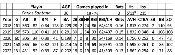 Santana has one of the better approaches in baseball (strikeout rate – 17.4 and walk rate – 14.0), but his contact batting average has been insanely low in 2020 (.252), 2021 (.261), and 2022 (.2540. In addition, he continues to have post a shallow line drive rate (6.9) with a low HR/FB rate (12.6). His average hit rate (1.862) had a rebound in 2022 while delivering weakness in his RBI rate (13).