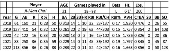 His bat was worthless against left-handed pitching (28-for-121 with no home runs and 14 RBIs) over the past two seasons. Choi had a productive first 216 at-bats (.278/26/7/41) in 2022 before fading after the All-Star break (.164/10/4/11 over 140 at-bats).
