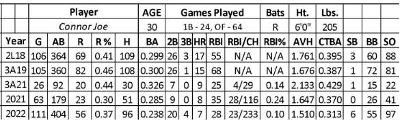 Joe had an empty bat over his first three seasons of the minors (.251 with 120 runs, 11 home runs, 106 RBIs, and four steals over 986 at-bats) despite showing the ability to take walks (11.8%). His bat emerged between AA and AAA (.303 with 171 runs, 41 home runs, 148 RBIs, and five stolen bases over 816 at-bats). His strikeout rate (19.3) beat the league average while improving his walk rate (14.8).