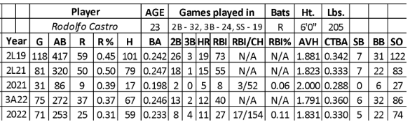 Over his six seasons in the minors, Castro hit .248 with 247 runs, 66 home runs, 279 RBIs, and 32 stolen bases over 1,774 at-bats. He had a productive start to his AAA season in 2022 (.246/37/12/40/6 over 272 at-bats) while having a high strikeout rate (27.4).