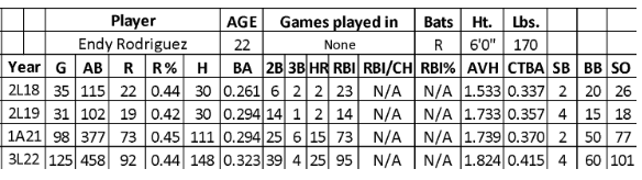 Over his first two seasons in the minors, Rodriguez only had 217 combined at-bats, leading to a .276 batting average with 41 runs, four home runs, 40 RBIs, and six steals. His bats developed to an elite over the past two seasons (.310/165/40/168/6 over 835 at-bats) while offering an excellent approach (strikeout rate – 18.4 and walk rate – 11.4).
