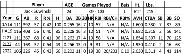 Over six seasons in the minors, Suwinski hit .239 with 289 runs, 59 home runs, 248 RBIs, and 31 steals. His swing gained steam at AA (.273/81/22/71/12 over 418 at-bats), leading to a promotion to AAA (.214/19/6/18/1 over 117 at-bats) despite striking out 49 times (41.9%).