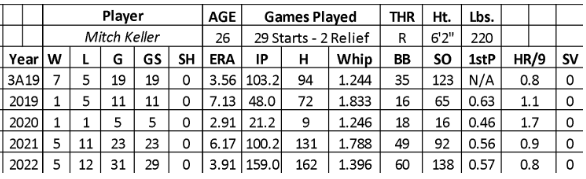 The Pirates drafted Keller in the second round in the 2014 MLB June Amateur Draft out of high school. Over seven seasons in the minors, he went 37-22 with a 3.13 ERA and 605 strikeouts over 567.1 innings. In addition, his walk rate (2.9) and strikeout rate (9.6) played. Keller solved AA (11-4 with a 2.83 ERA and 121 strikeouts over 120.2 innings) while needing more work at AAA (11-8 with a 3.86 ERA and 219 strikeouts over 184 innings).