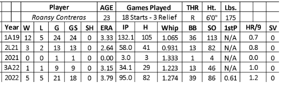 Last season, Contreras made Pittsburgh’s opening-day roster, leading to success over his first three games (three runs over 7.2 innings with ten strikeouts), but the Pirates decided to move him back to AAA for his next five starts (2.66 ERA, .181 BAA, and 24 strikeouts over 20.1 innings). He handled himself well over seven matchups back with Pittsburgh (2.60 ERA and 32 strikeouts over 34.2 innings) despite walking 16 batters. The Brewers lit him up on July 1st (seven runs, seven baserunners, and three runs over 1.2 innings), pushing him back to AAA at the All-Star break.