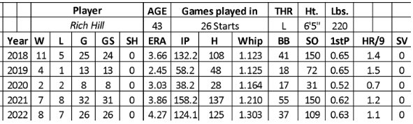 A knee issue in July led to a month on the injured list. Hill pitched well in three (no runs over 18 innings with 27 strikeouts) of his final 11 starts, but he still had weakness in his ERA (4.36) and WHIP (1.322).