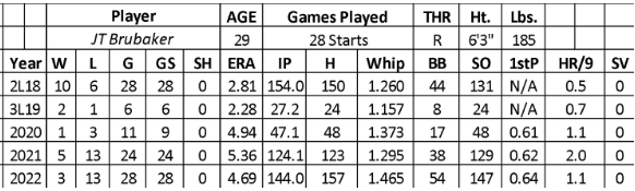 Over five seasons in the minors, Brubaker went 31-28 with a 3.60 ERA and 433 strikeouts over 514.1 innings. His walk rate (2.7) was favorable while delivering a low number of strikeouts (7.6 per nine). He had his best output at AAA (10-5 with 3.02 ERA and 116 strikeouts over 140 innings).