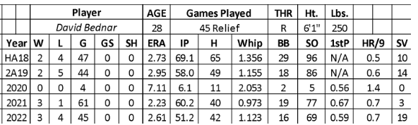 Last year, Bednar had an excellent start to the season over 24 innings (0.75 ERA, 0.667 WHIP, .145 BAA, 31 strikeouts, and nine saves). His arm didn’t look right over his next 20 games (12 runs, 34 baserunners, and 32 strikeouts over 22.2 innings) while converting eight of his 12 save tries. Unfortunately, he landed on the injured list for almost two months with a back injury. Over his final five innings, Bednar allowed one run and six hits while adding six strikeouts and two saves.