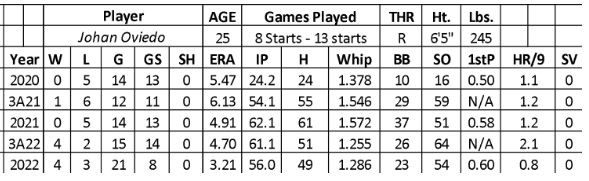 Oviedo never developed as a starter in his six seasons in the minors (31-30 with a 4.61 ERA and 503 strikeouts over 480.2 innings). In addition, he failed in 2020 and 2021 in the majors for the Cardinals (0-8 with a 5.07 ERA, 1.517 WHIP, and 67 strikeouts over 87 innings).