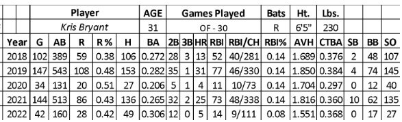 Since 2016, Bryant hasn’t had more than 380 RBIs chances in a season. In addition, his RBI rate (14.2 in his career) has been below a top-run producer (13.0%) over the past six seasons.