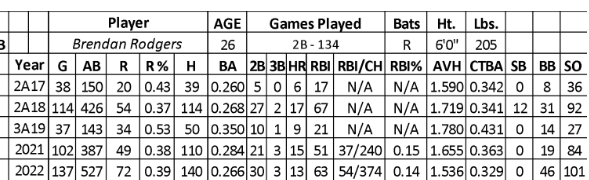 The Rockies selected him third overall in the 2015 MLB June MLB Draft. Over six seasons in the minors, Rodgers hit .298 with 248 runs, 66 home runs, 248 RBIs, and 24 steals over 1,541 at-bats. His strikeout rate (19.3) should be about league average in the majors while needing to improve on his walk rate (6.4).