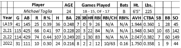 He stalled at High A (.239/19/4/18/3 over 134 at-bats) in 2021 while hitting his stride at AA in 2022 (.318 over 264 at-bats with 39 runs, 13 home runs, 47 RBIs, and 17 stolen bases). His walk rate (8.5) beat the league average with a step back to league average in his strikeout rate (21.7).