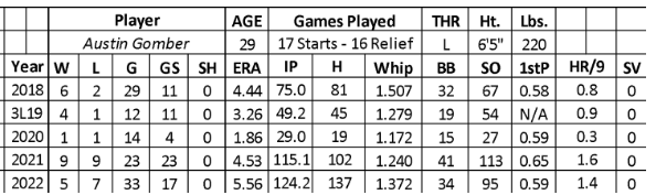 His arm was a disaster over his first 12 starts last season (6.43 ERA, 1.476 WHIP, and .296 BAA over 63 innings) despite allowing two runs or fewer in five games. Gomber had a 4.18 ERA, 1,1258 WHIP, and 41 strikeouts over his final 51.2 innings while seeing most of his action out of the bullpen.