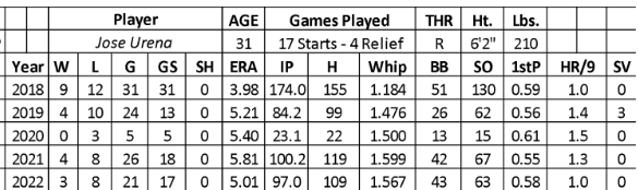 Urena brings a low flyball rate (29.0) to the mound with a better-than-unexpected fastball (96.2 mph). The downside to his major league career has been his inability to strikeout batters (6.1 per nine) while walking too many batters (4.0 per in 2022 and 3.3 in his career).