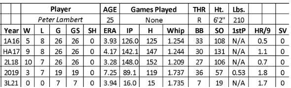 Lambert looked to be improved at AA in 2018 (8-2 with a 2.23 ERA and 75 strikeouts over 92.2 innings), but he did lose his way at AAA (5.06 ERA, 1.435 WHIP, and 82 strikeouts over 115.2 innings).