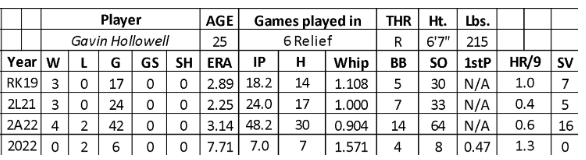 That same season at rookie ball with Colorado, Hollowell had an excellent rebound in all areas (3-0 over 18.2 innings with 30 strikeouts and seven saves). Over the past two seasons in the minors, he posted a 2.85 ERA, 97 strikeouts, and 21 saves over 72.2 innings.