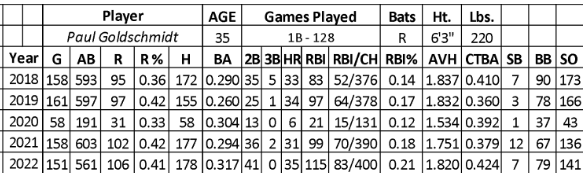 Over the past two seasons, Goldschmidt regained his elite form by hitting .305 over 1,164 at-bats with 1,164 runs, 66 home runs, 214 RBIs, and 19 steals. He was the second-best hitter in baseball in 2022 based on his FPGscore (9.54) while finishing 14th in 2021 (6.15).