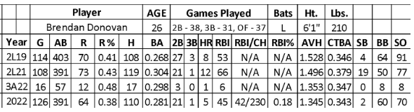 Over four short seasons in the minor, Donovan hit .285 with 157 runs, 21 home runs, 127 RBIs, and 23 steals over 867 at-bats. His walk rate (12.0) has top of the batting order upside while offering a favorable strikeout rate (17.9). His contact batting average (.343) and average hit rate (1.345) regressed as he moved up the Cardinals’ system.