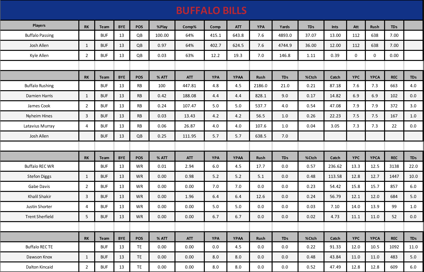 The 2023 NFL season is right around the corner and that means fantasy football drafts are underway. Before you assemble your championship dynasty, redraft, or high-stakes squad, FullTime Fantasy members will have an in-depth, player-by-player preview of all 32 teams from football legend Shawn Childs. Up next in our extensive NFL and fantasy football preview series is Shawn's deep dive into the 2023 Buffalo Bills Outlook. -- Quarterback -- Josh Allen Over the past three seasons, Allen has been the best fantasy quarterback in the league. Allen has produced 15,180 combined yards with 129 touchdowns. On the negative side, his interceptions have risen each year in the NFL (5, 7, 8, 10, and 12). He gains a massive edge as a runner, highlighted by his last two seasons (122/763/6 and 124/762/7). Since arriving in the NFL, Allen has had 38 rushing scores in 77 games. After a fast start over his first six games (33.12 FPPG in four-point passing TD leagues) in 2022, he scored more than 30.00 fantasy points in only two other contests (33.45 and 39.90) over his final 12 starts of the year. In Week 9, the Jets held him to 205 passing yards with no TDs via the air. Allen also exited that game with an injured right elbow. Allen played through the issue with his regression shown in his passing yards (249.6 yards) and passing touchdowns (1.9) per game over his final 10 starts. Buffalo still needs to develop their secondary receiving options behind Stefon Diggs (108/1,429/11 on 154 targets). This is something Allen needs to reach a higher ceiling in passing production. The addition of TE Dalton Kincaid should be a big win for the Bills’ passing game. Gabe Davis (48/836/7) must improve his catch rate (51.6 – 54.1 in his career). Also, Davis needs to eliminate drops (16 over the past two seasons) to reach a competitive WR2 status. Fantasy Outlook: In the early draft season in the high-stakes market, Allen ranks second behind Patrick Mahomes at quarterback. Despite the appearance of greatness, his yards per pass attempt (7.4 over the past three seasons) have yet to reach an elite area. He gains plusses for his ability to run and score on the ground, along with having an elite WR1. This combination puts Allen in an elite fantasy area while potentially having another gear if the Bills’ young tight end hits the ground running and their WR2 and WR3 increase their production. With a floor of 5,000 combined yards and 40 touchdowns, he projections to be another edge in 2023. Next step: 5,400 yards and 45 scores. Other Options: Kyle Allen, Matt Barkley -- Running Backs --