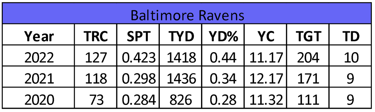 In his four seasons with the Ravens, Edwards gained at least 5.0 yards per rush every year (5.2, 5.3, 5.0, and 5.0). He has limited value in the passing game (18/194 – no catches in 2022), but his play in this area flashed more explosiveness in 2020 (9/129 – three catches over 20 yards) while finishing with 852 combined yards with six scores and nine catches on 144 carries). Baltimore gave him more than 10 touches in six of his 18 games (including playoffs). Edwards also blew out his left knee before Week 1 in 2021, leading to no touches. His slow recovery led to him missing the first six games last season. After two helpful games (16/66/2 and 11/65), Edwards was back on the sidelines for the following three weeks with a hamstring issue. Over his final seven appearances, he gained 354 combined yards with one touchdown and one catch. Fantasy Outlook: Edwards posted a floor of 700 rushing yards in his first three years with the Ravens. He plays with power while offering a closing mentality when Baltimore plays from the lead. Edwards should be back to full strength at the start of the year while resuming his RB2 role for Baltimore. I expect himWHAT CAN WE EXPECT OUT OF THE RAVENS IN 2023?
