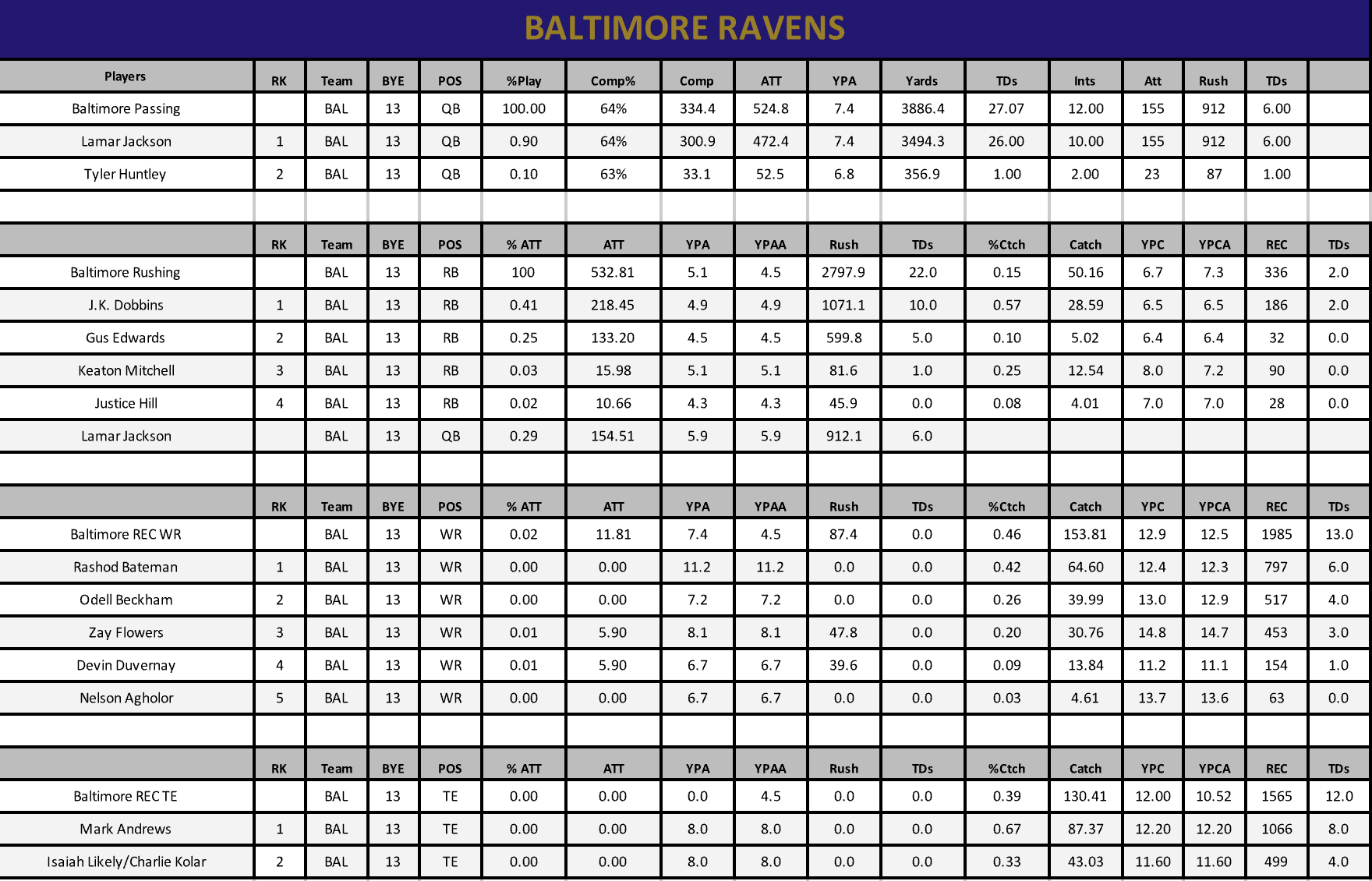 The 2023 NFL season is right around the corner and that means fantasy football drafts are underway. Before you assemble your championship dynasty, redraft, or high-stakes squad, FullTime Fantasy members will have an in-depth, player-by-player preview of all 32 teams from football legend Shawn Childs. Also, check out Jody Smith's NFL offensive line rankings and exclusive 2023 Strength of Schedule analysis. Up next in our extensive NFL and fantasy football preview series is Shawn's deep dive into the 2023 Baltimore Ravens Outlook. -- Offense --