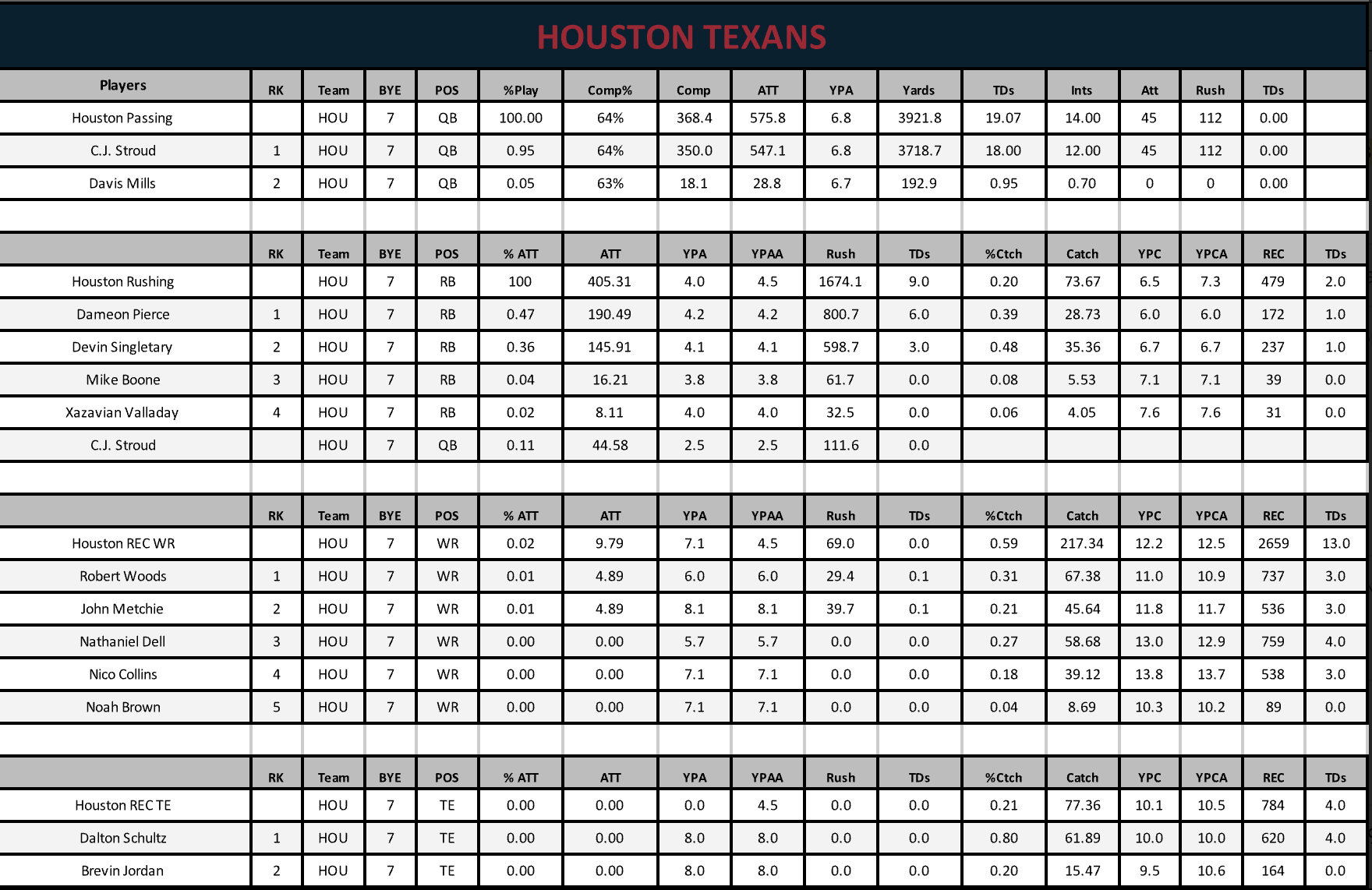 Houston ranked 25th in passing yards (3,642) with 20 touchdowns and 19 interceptions while gaining 6.3 yards per pass attempt. Their offensive line allowed 38 sacks.
