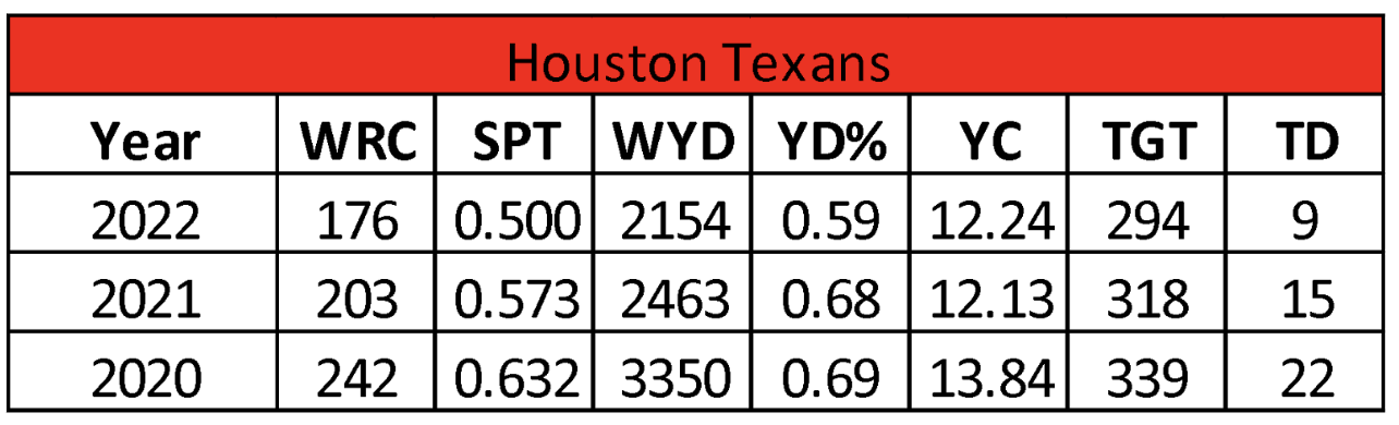 The loss of Deshaun Watson and DeAndre Hopkins showed in the regression of the Texans’ wide receiver production over the past two seasons. They set a three-year low in all categories in 2022. Their wideouts finished with only 50% of the team’s completions while gaining 59% of their passing yards. Houston needs some to emerge as their WR1, along with C.J. Stroud being the real deal at quarterback, to regain lost momentum in the wide receiver stats.