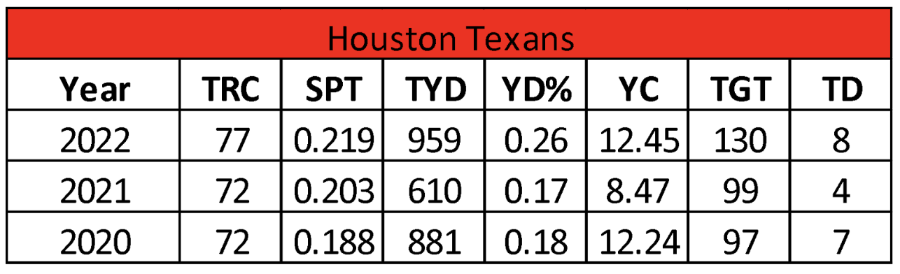 The Texans’ tight ends have had between 71 and 77 catches over the past four seasons. Last year they had a spike of 31 targets over 2021 but had a regression in their catch rate (59.2 – 72.7). On the positive side, they set three-year highs in receiving yards (959) and touchdowns (8). This season the addition of Dalton Schultz gives Houston their best tight end option in a few years.