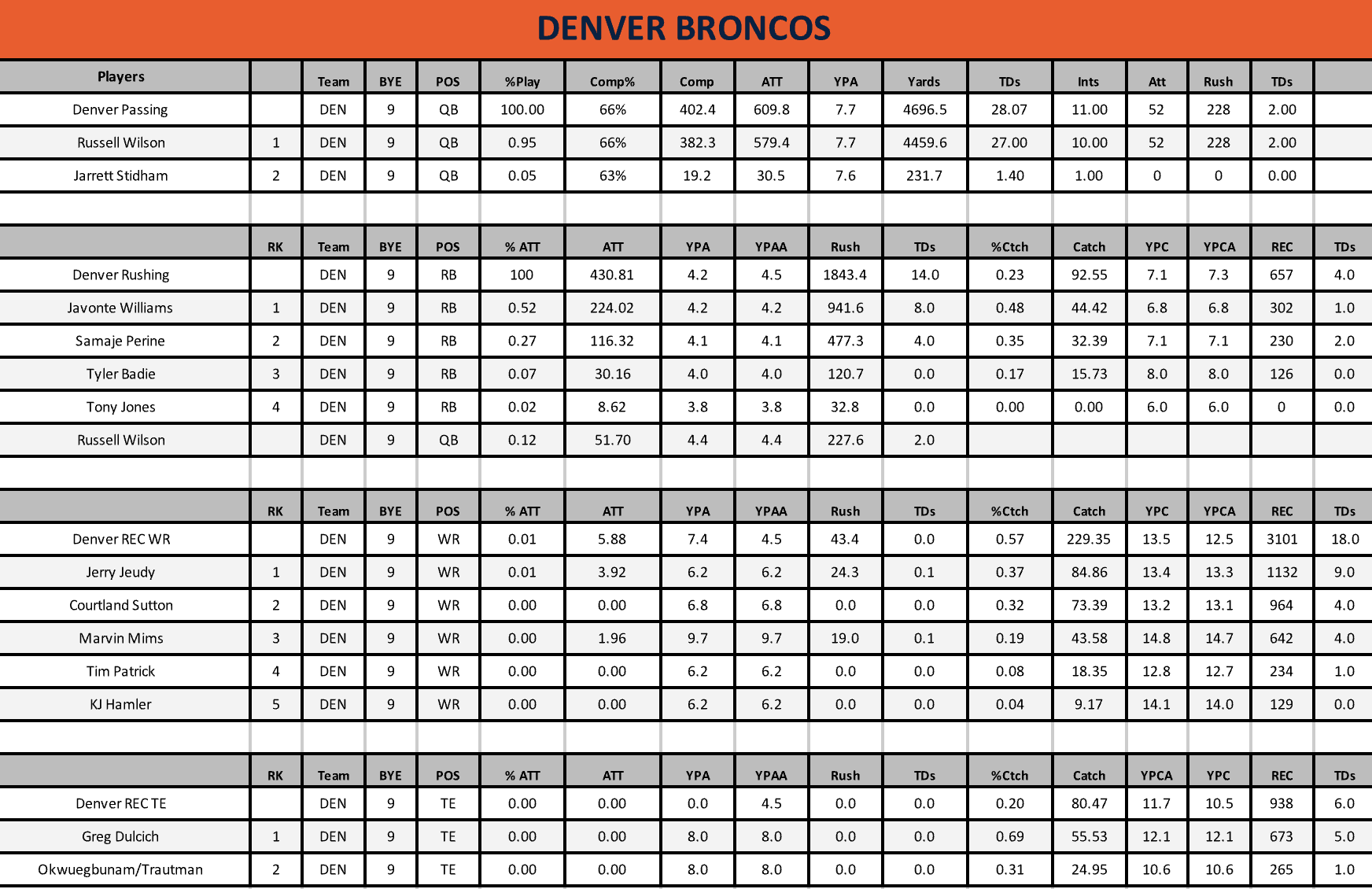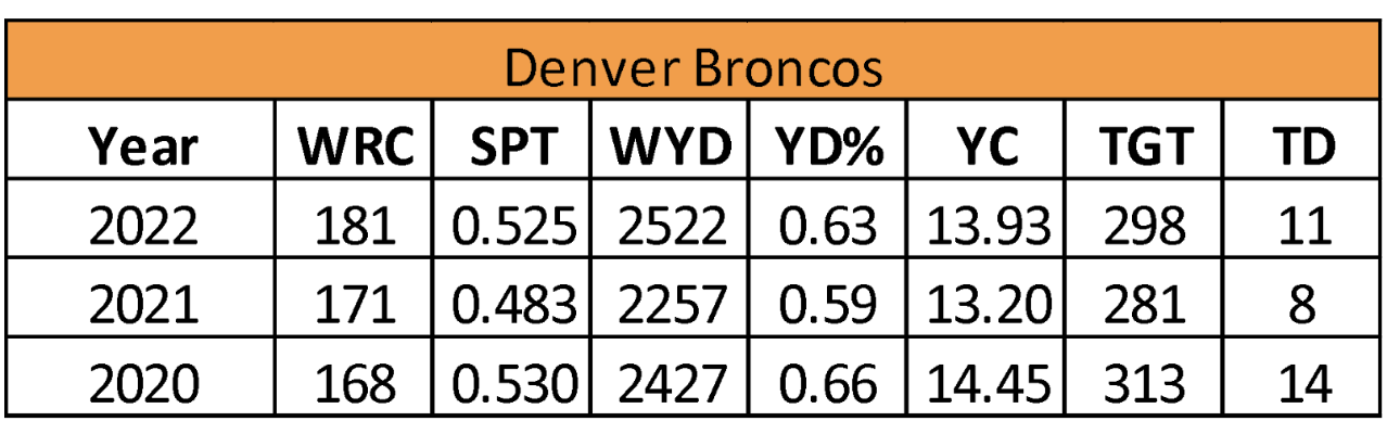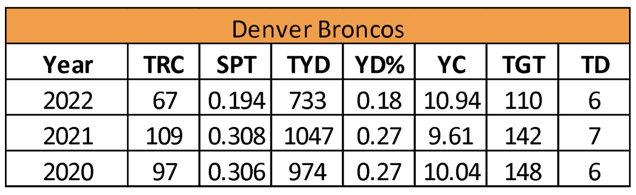 The switch to Russell Wilson and a dismal pass-blocking offensive line led to the Broncos setting three-year highs in catches (96), receiving yards (751), targets (132), and yards per catch (7.8). Their running backs combined for 2,402 yards with 10 touchdowns and 96 catches (23.32 FPPG in PPR formats).