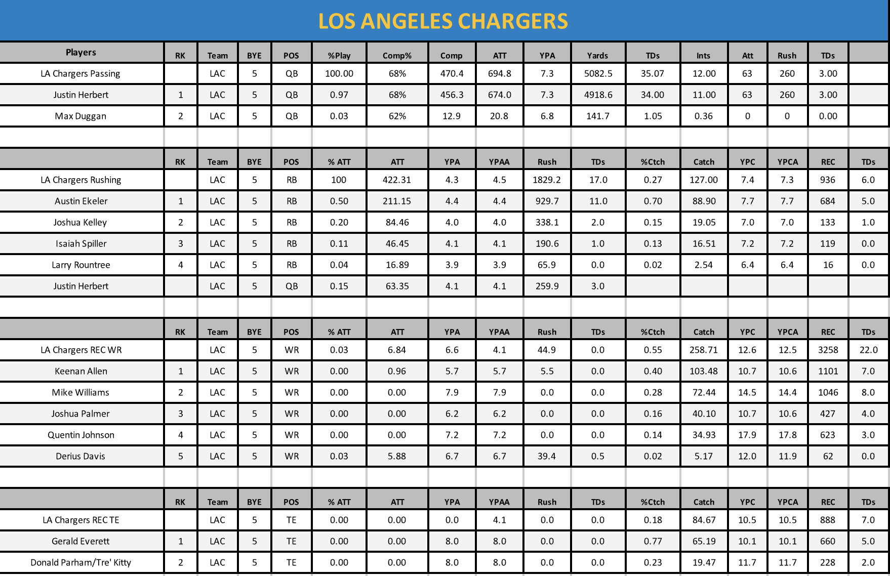LA dipped to 3rd in the NFL passing yards (4,791). Their offensive line allowed 39 sacks. The Chargers finished with 26 passing touchdowns and 10 interceptions, with receivers gaining more than 20 yards on 50 plays.
