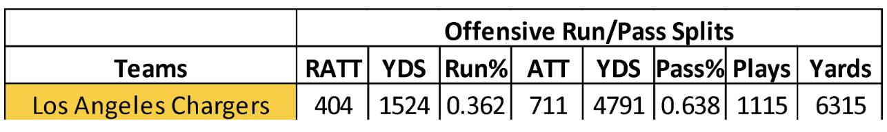 The Chargers fell to 30th in the NFL in rushing yards (1,524) while gaining only 3.8 yards per carry. They scored 15 rushing touchdowns with only six runs over 20 yards. Los Angeles averaged 23.8 rushes per game (27th).