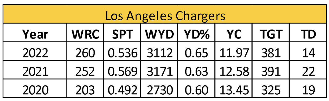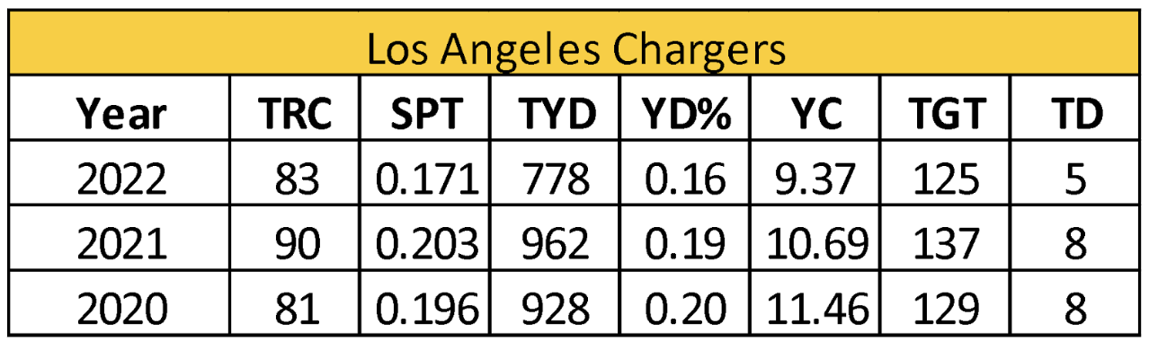 The Chargers’ tight ends had a step back in catches (83), receiving yards (778), touchdowns (5), and targets (125) from 2021 despite Los Angeles throwing the ball 751 times. They finished with 17.1% of the team’s completions and 16% of their receiving yards. Part of their regression was a three-year low in yards per catch (9.4).