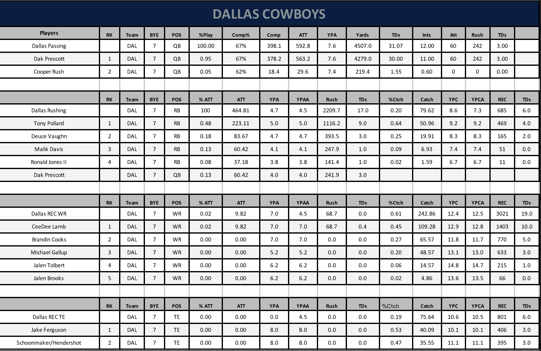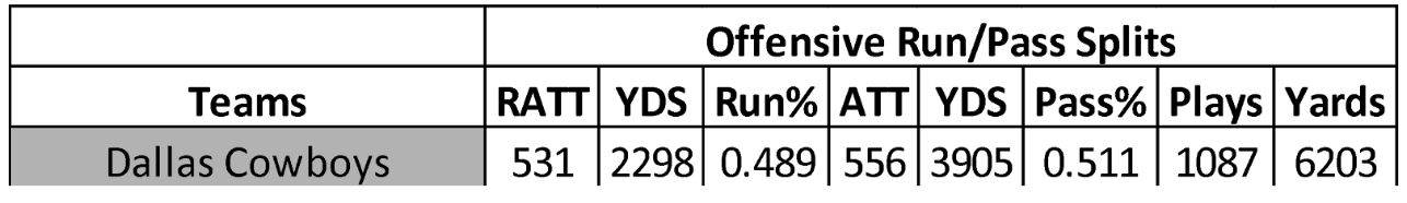 Dallas inched to 8th in rushing yards (2,298) with 24 touchdowns and 17 runs over 20 yards. They averaged 31.2 rushes per game and 4.3 yards per carry.