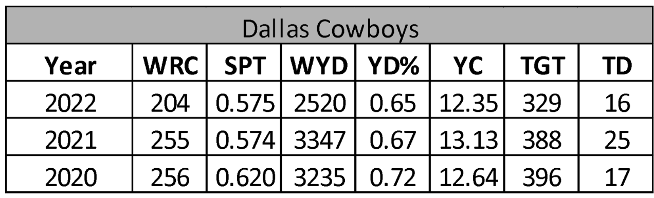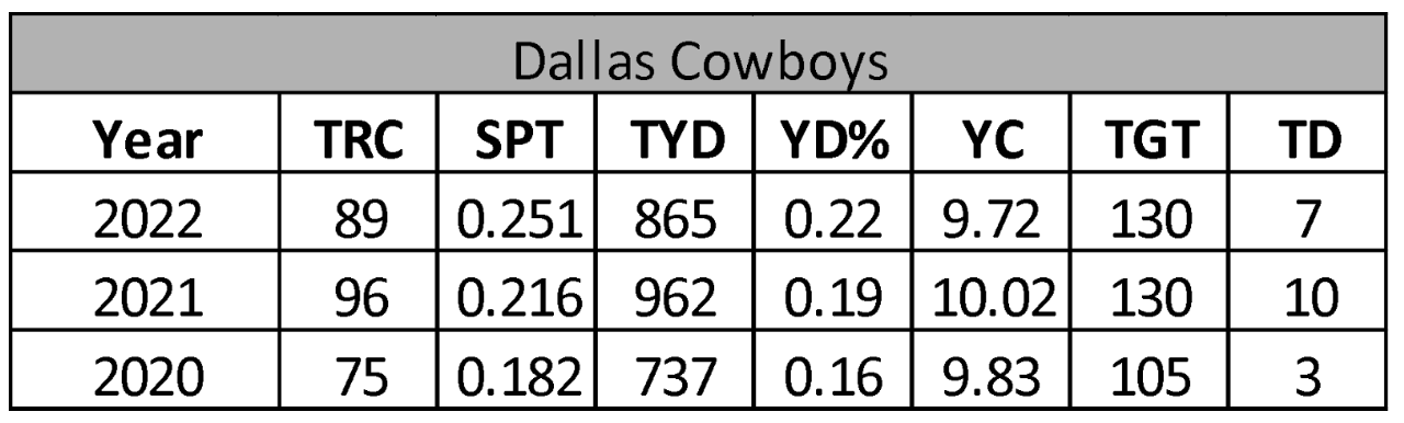 The downgrade in wide receiver talent on the Cowboys was highlighted by their lower production last season. Their wideouts had a decline of 51 catches for 827 yards and nine touchdowns on 59 targets. Dallas threw the ball 91 fewer times in 2022. They maintained their percentage (57.5) of the team’s completions while gaining 65% of their receiving yards.
