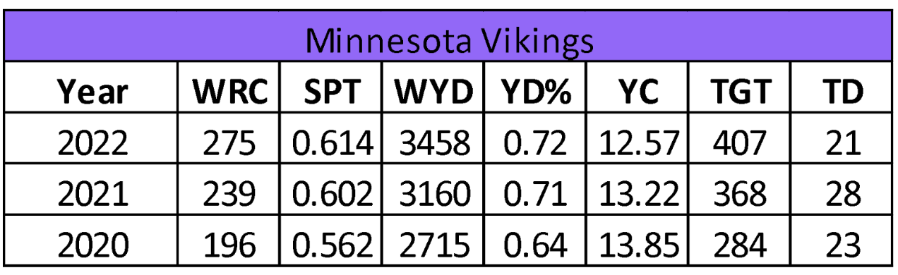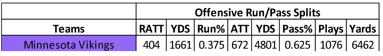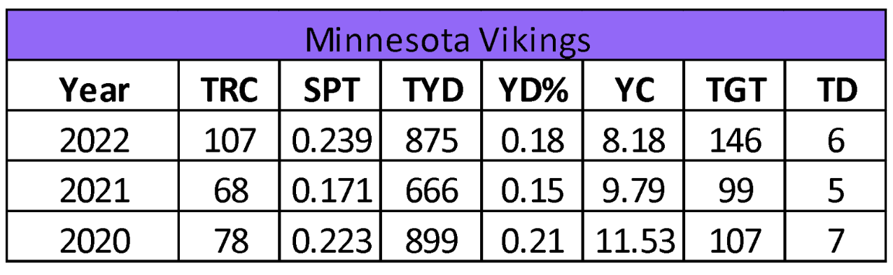 The Vikings running back production in rushing yards (1,556) and receiving yards (493) declined in back-to-back seasons. In addition, their yards per rush (4.2) is trending in the wrong direction. They set three-year lows in rushing attempts (369), catches (66), and targets (88). Their backs gained 2,049 yards with 19 touchdowns and 66 catches (22.64 FPPG in PPR formats). The only positive out of last year was Minnesota’s willingness to run the ball in close for touchdowns.