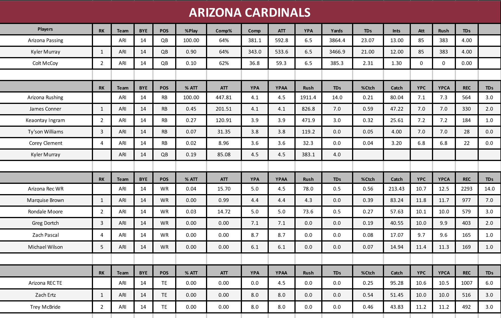 Arizona’s wide receivers set a three-year high in catches (266) and targets (404), but they posted lower results in receiving yards (2,691), yards per catch (10.1), and touchdowns (11). Their wideouts gained 66% of the team’s receiving yards or more over the past three seasons.