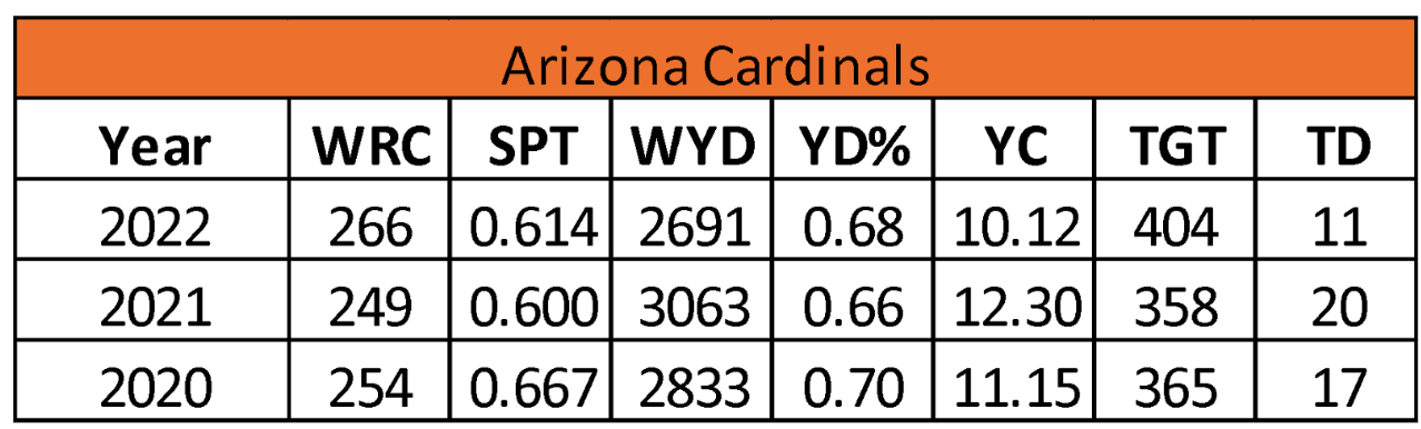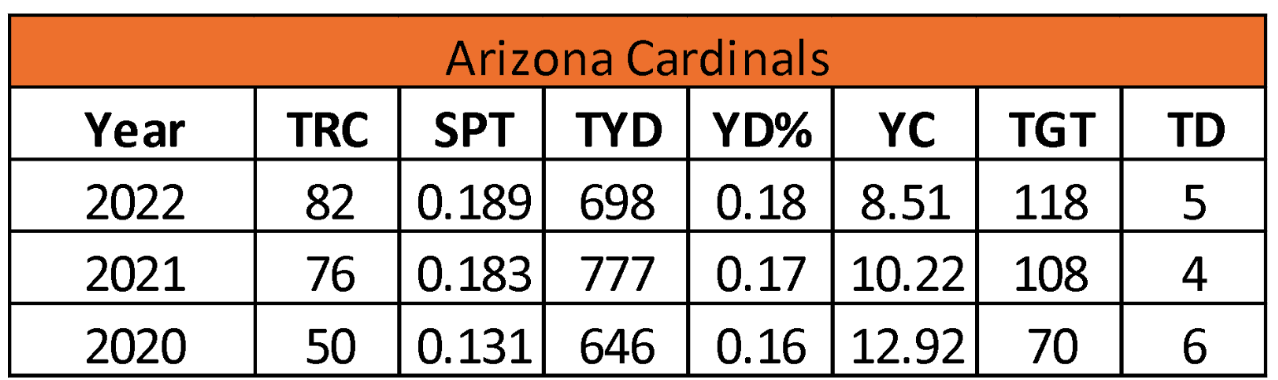 The tight end opportunity in Arizona has been trending up over the past two seasons after adding Zach Ertz. Consequently, they set three-year highs in catches (82) and targets (118) in 2022, but their tight ends gained only 8.5 yards per catch.